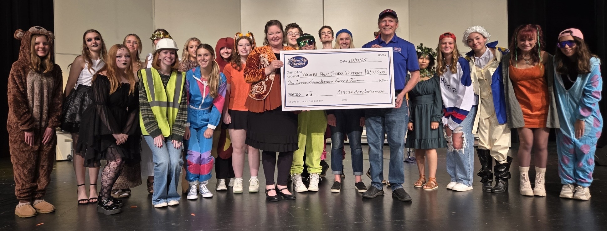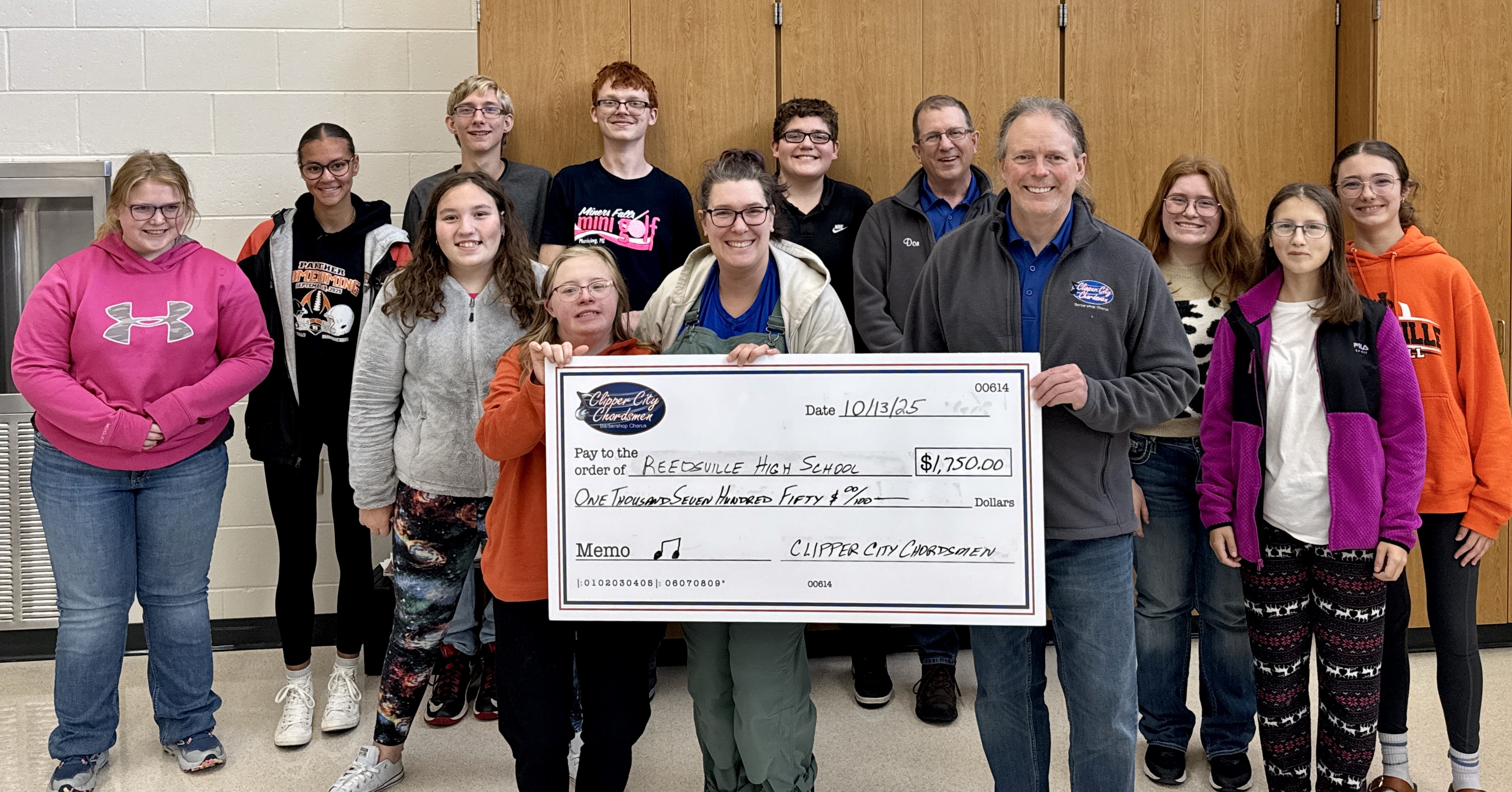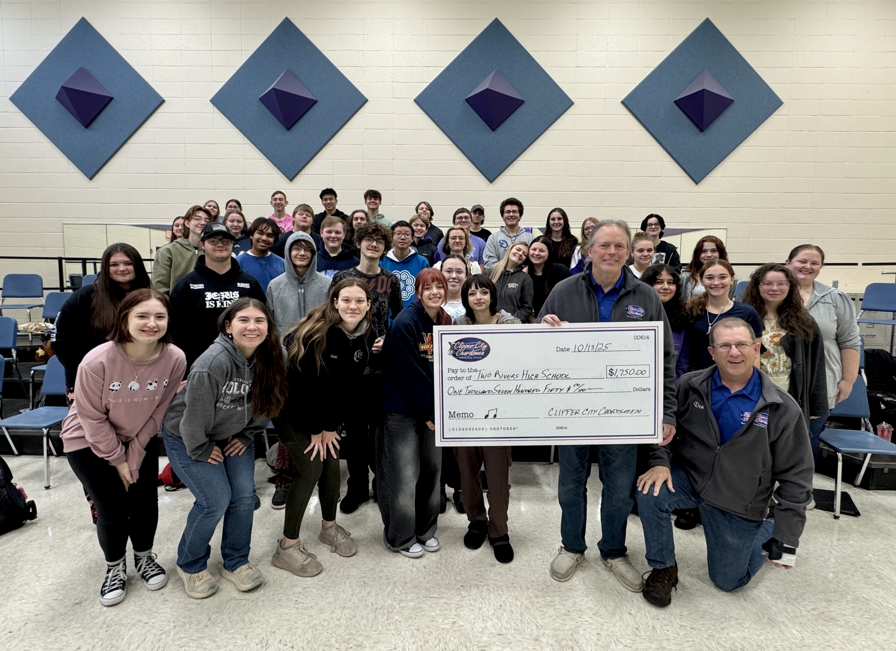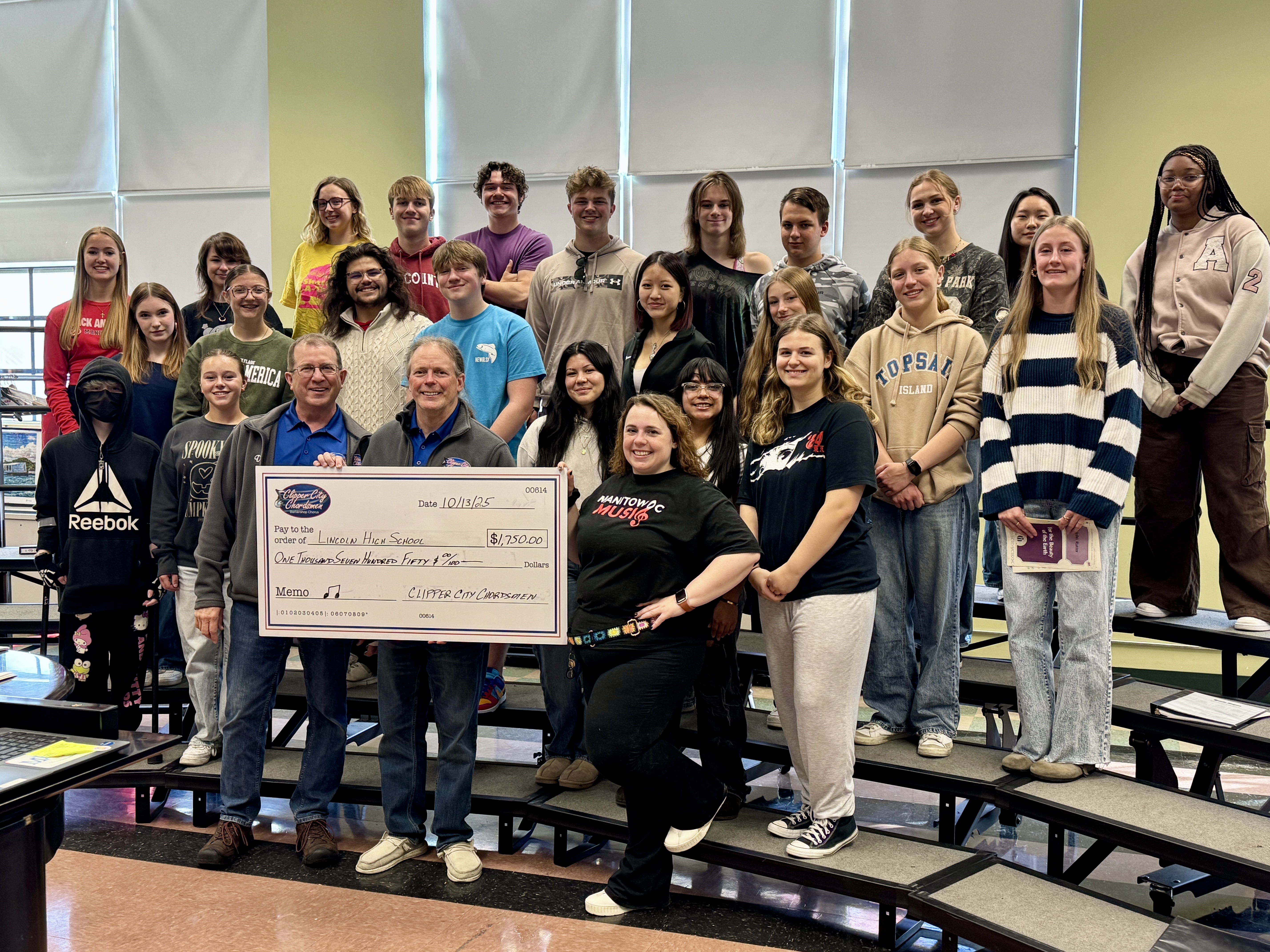 In 2024, a larger fundraiser show was held at the Franciscan Center for Music Education and Performance in Manitowoc with seating of over 450. With the chorus from Two Rivers High School and instrumental music students from the Franciscan Center performing alongside the Chordsmen, nearly $7,000 was raised. Checks for $650 were delivered to eight school districts in Manitowoc County as well as to the Franciscan Center.