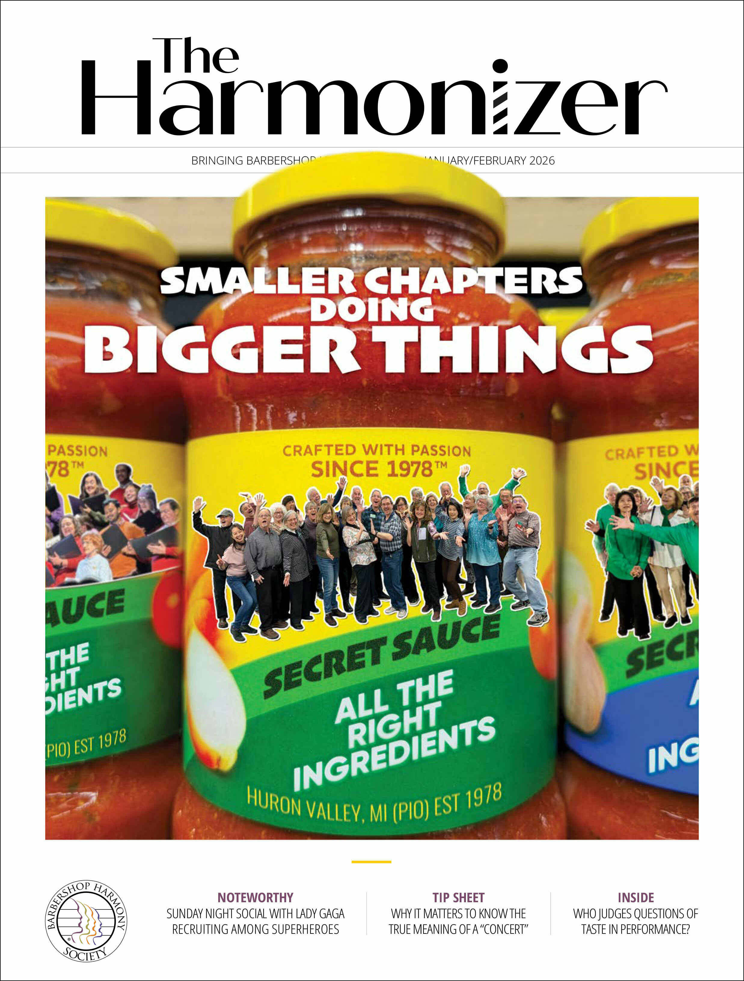 Published since November 1941, The Harmonizer is the Barbershop Harmony Society's premier magazine publication, delivered bi-monthly to over 19,000 members, associates, and barbershop enthusiasts across the United States and Canada.