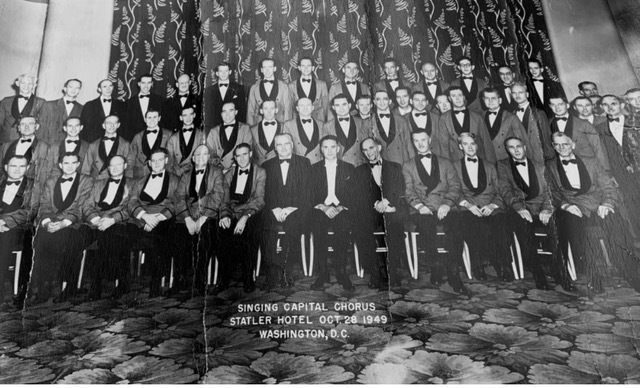 In 1947, two chapter quartets—the Washington Diplomats and the Potomac Clippers—performed at Carnegie Hall and qualified to compete at the International Convention in Oklahoma City. That same year, annual dues were $6.00, and the chapter held its first Ladies Night on September 22, complete with entertainment by chapter quartets, a ladies trio, and free Pepsi-Cola.